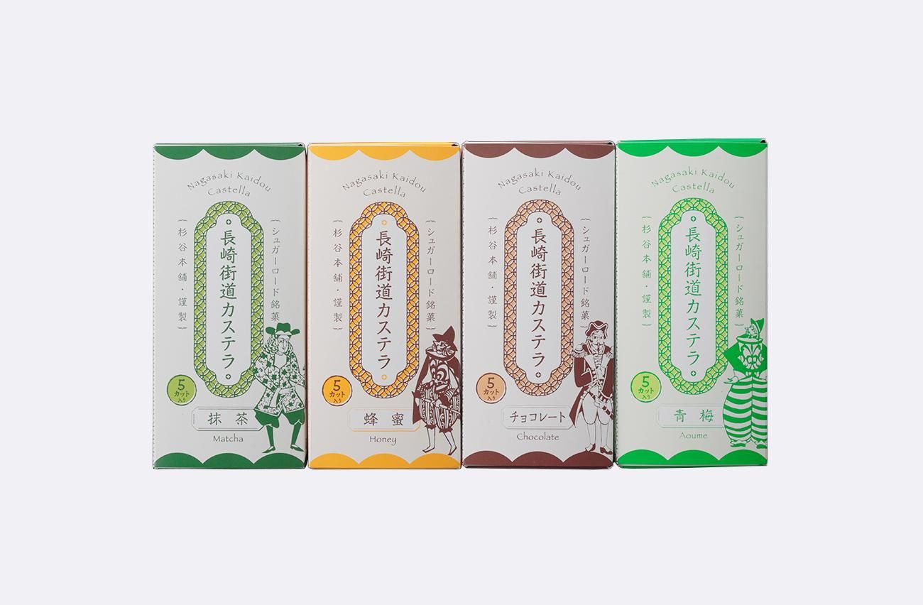 長崎街道カステラ不動の一番人気「蜂蜜風味」はもちろん、「抹茶風味」「チョコレート風味」の定番カステラに、杉谷本舗オリジナルの「青梅風味」を加えた4種類。
